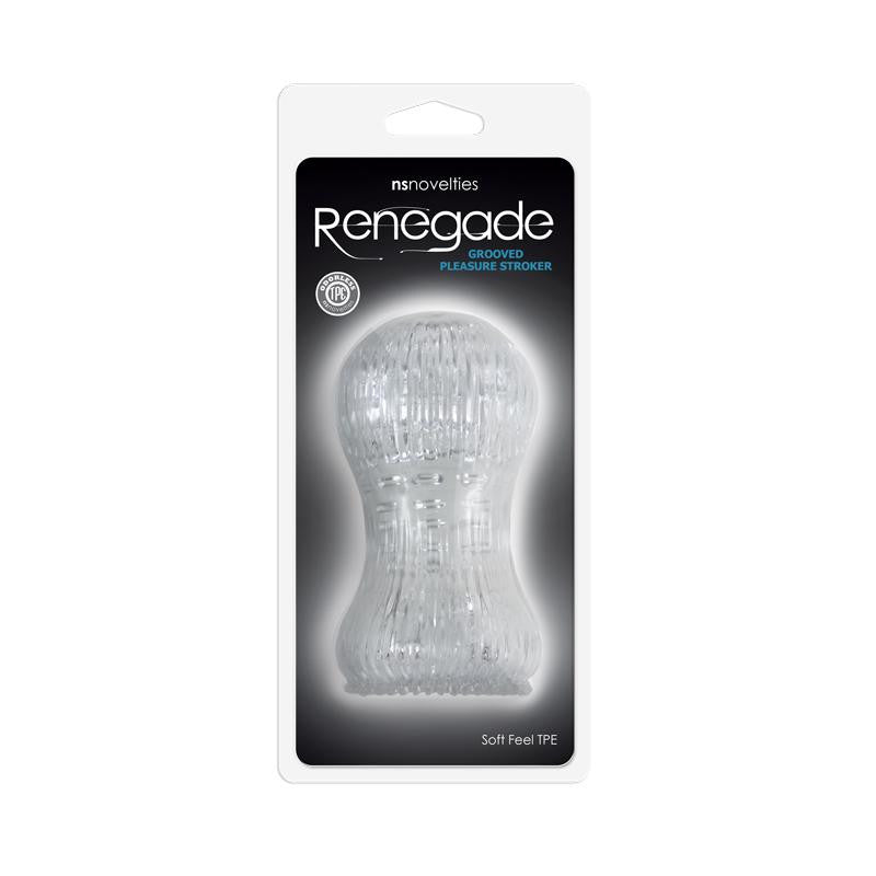 Renegade Grooved Pleasure Stroker Clear. Renegade Textured Strokers are ribbed internally and externally for non-slip grip and sensational pleasure. Body safe Thermoplastic Elastomers TPE is super stretchy providing a snug fit on your manhood. Open ended allows for easy cleaning. Waterproof and safe to use with your favorite lubricants.
